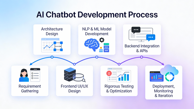 AI chatbots require continuous improvement to stay efficient and accurate. After deployment, developers monitor the bot’s performance, user interactions, and drop-off points. New data is used to retrain and enhance the AI model so responses keep improving. Regular updates, new features, security patches, and language expansions are added over time. This ensures the chatbot evolves with changing business needs and user expectations.